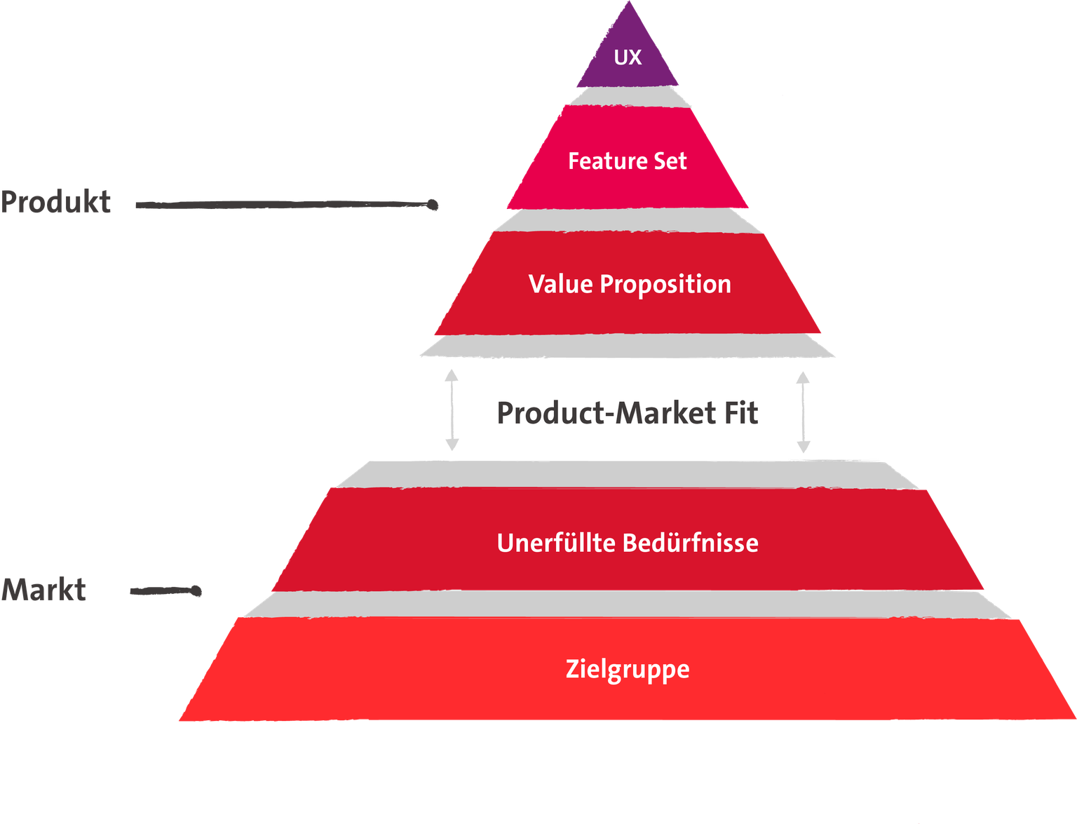 Warum sprechen wir bei einem Loyalty-Programm überhaupt über Product-Market-Fit (PMF)? Ganz einfach: Ein Loyalty-Programm ist letztlich ein Produkt im Produktportfolio eines Unternehmens. Und wie bei jedem Produkt entscheidet der Fit zwischen Angebot und Marktbedürfnissen über Erfolg oder Misserfolg. Die Pyramide hilft, strukturiert von den Grundlagen bis zur finalen Umsetzung zu arbeiten und verhindert, dass man zu früh in die Feature-Denke einsteigt.