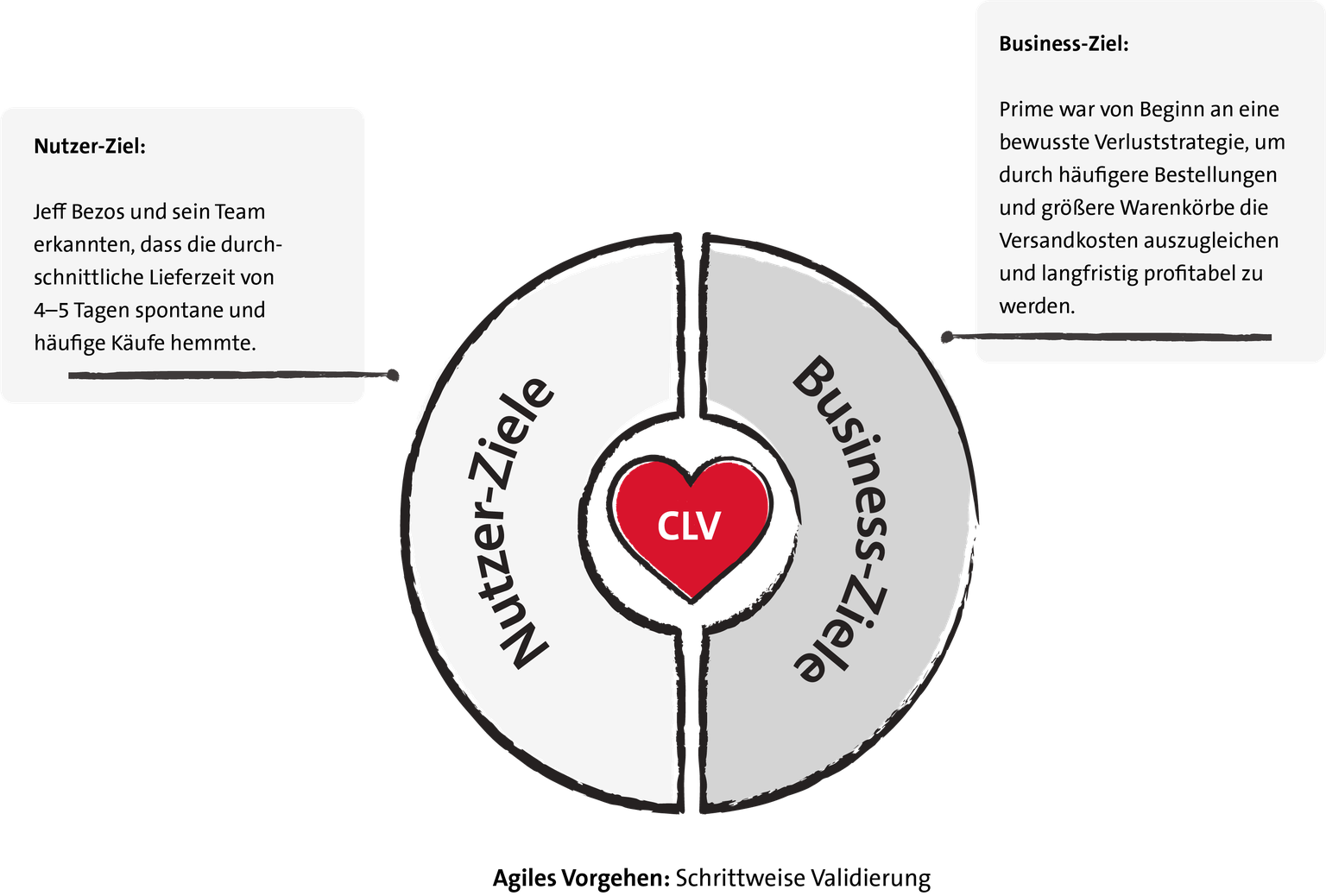 Amazon Prime ist nicht über Nacht entstanden. Jeff Bezos startete mit einem klaren Business Ziel: die Bestellhäufigkeit steigern, auch wenn das kurzfristig Verluste bedeutet. Parallel dazu identifizierte das Team ein klares Nutzerproblem: lange Lieferzeiten von vier bis fünf Tagen verhinderten spontane Käufe.