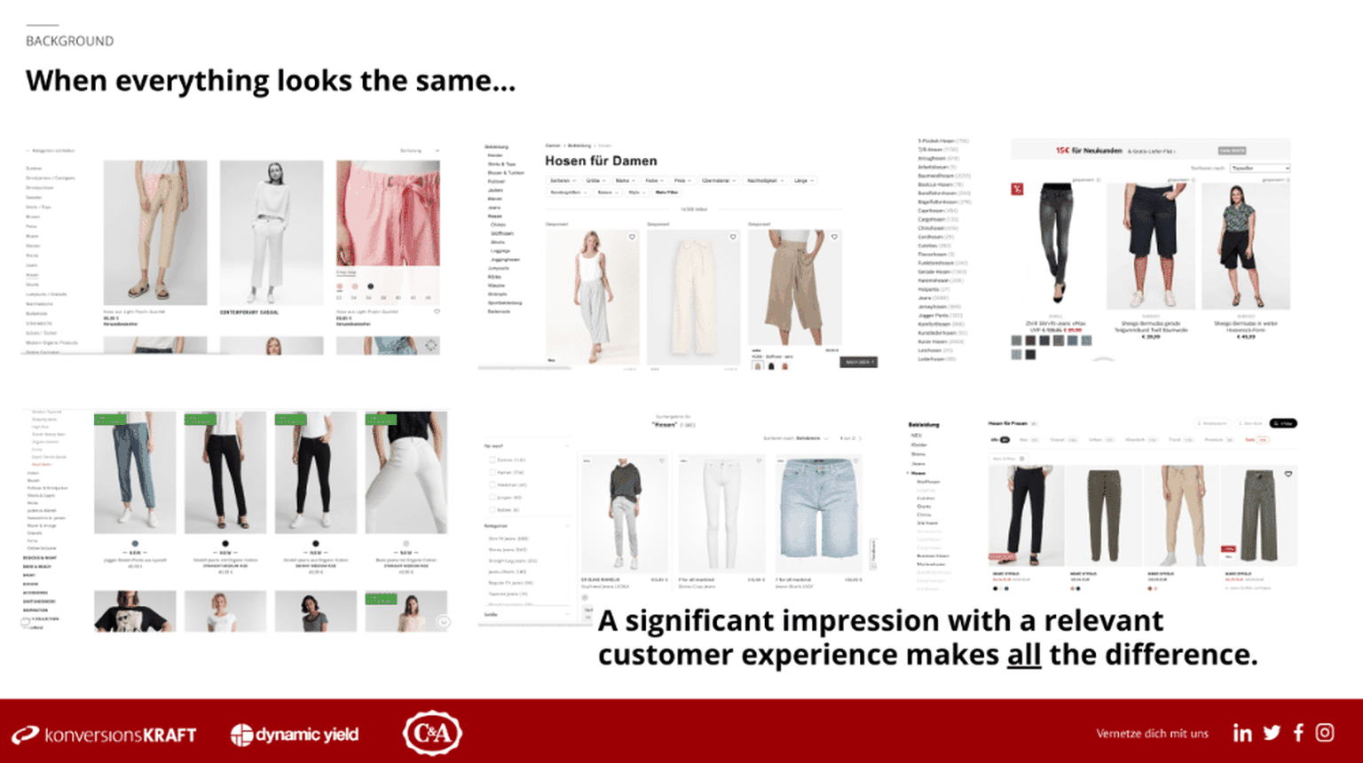 Wenn alle Shops gleich aussehen, quasi dieselbe Experience bieten, und allesamt “15 schwarze Hosen” anzeigen, warum sollte sich dein potenzieller Kunde für deinen Shop entscheiden?