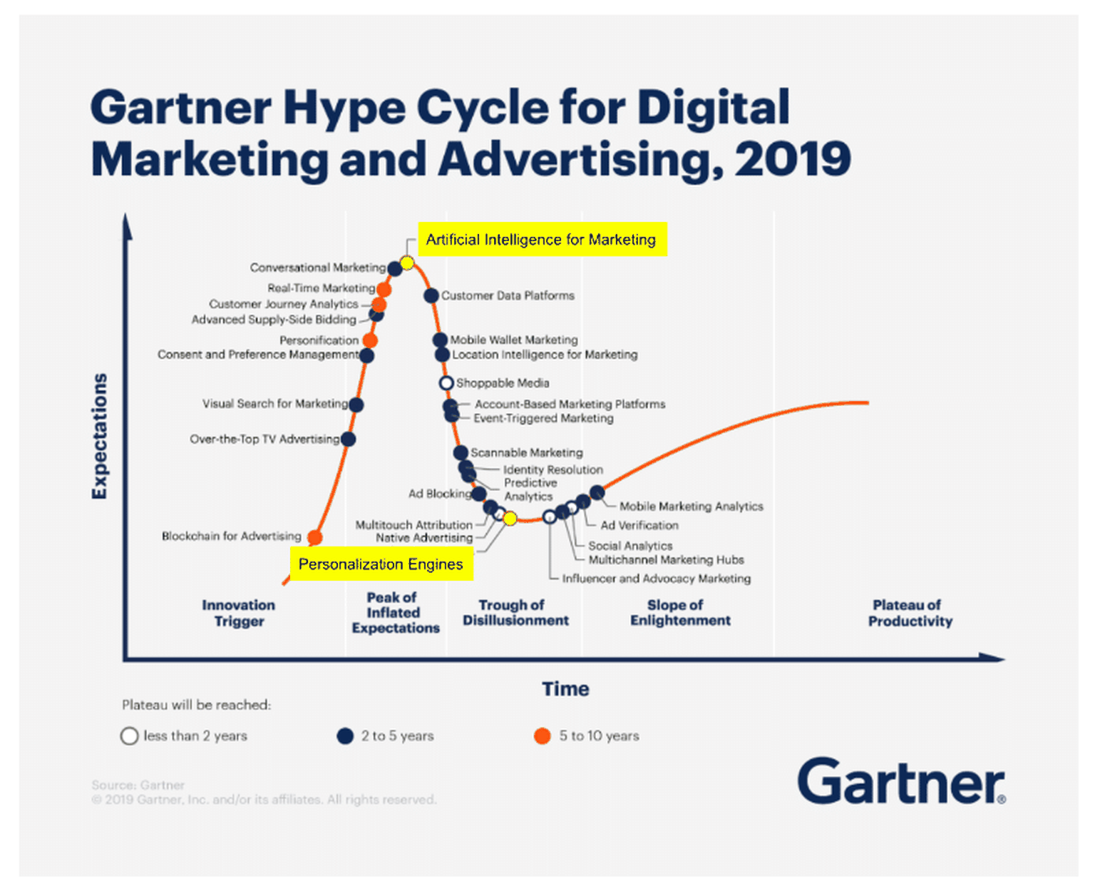 Während KI und ML-Integration im Marketing noch im Peak of inflated expectations (Gipfel der überhöhten Erwartungen) angesiedelt sind, ist die Personalisierung bereits im Tal der Desillusionierung angekommen.